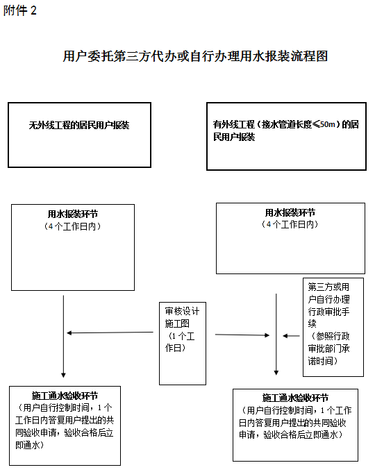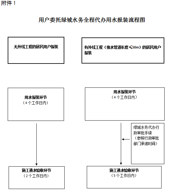 ①委托綠城水務全程代辦的,無外線工程施工通水驗收時間不超2個工作日,有外線工程外線工程長度≤50m施工通水驗收時間不超過5個工作日,不包含辦理行政審批手續時間。