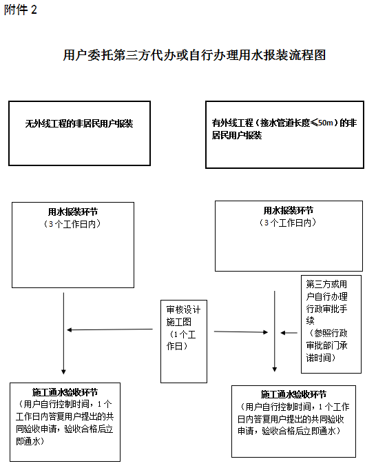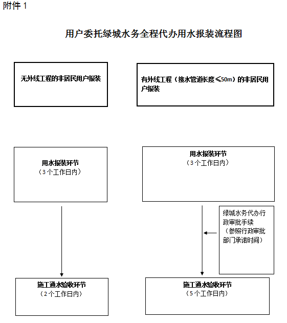 ①委托綠城水務全程代辦的,無外線工程施工通水驗收時間不超過2個工作日,有外線工程外線工程長度≤50m施工通水驗收時間不超過5個工作日,不包含辦理行政審批手續時間。