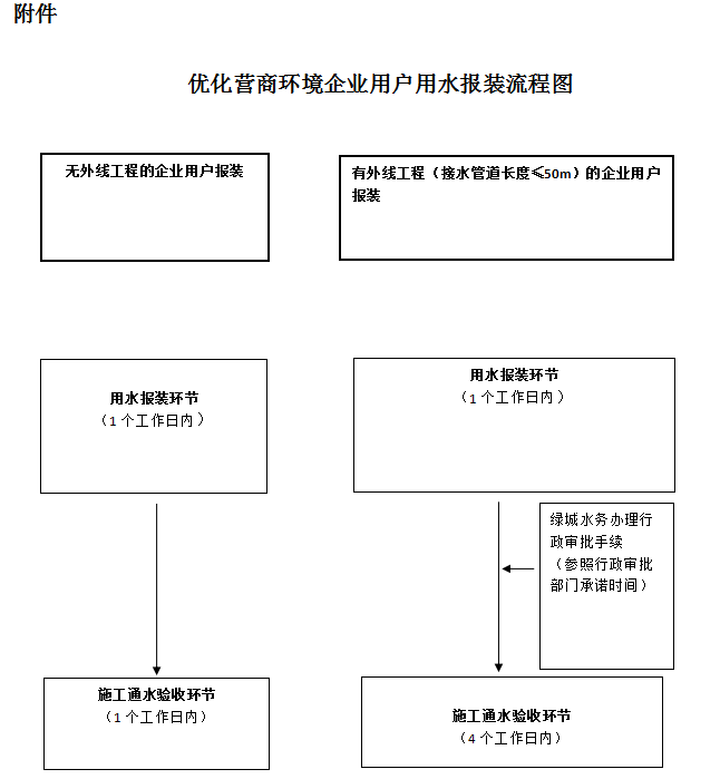 2.施工通水驗收環節:無外線工程施工通水驗收時間不超過1個工作日,有外線工程外線工程長度≤50m施工通水驗收時間不超過4個工作日,不包含辦理行政審批手續時間。