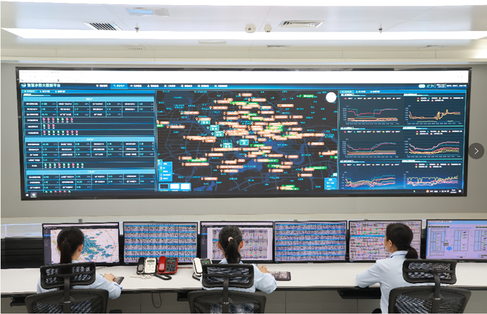 在綠城水務生產運營調度中心,值班工作人員打開智慧水務大數據平臺,生產調度系統總覽、GIS系統管網總覽,報裝系統總覽等信息一目了然。一邊盯著大屏幕上的數據,一邊點擊鼠標查看具體情況,幾名工作人員各司其職,密切監測著不斷傳輸來的各種數據,不時發出相應指令。