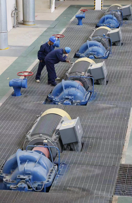 技術維護工人在送水泵站里巡檢設備